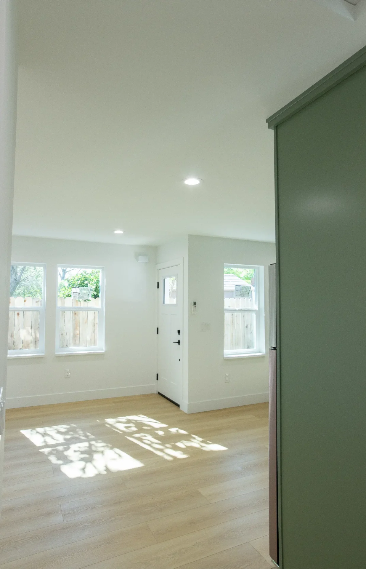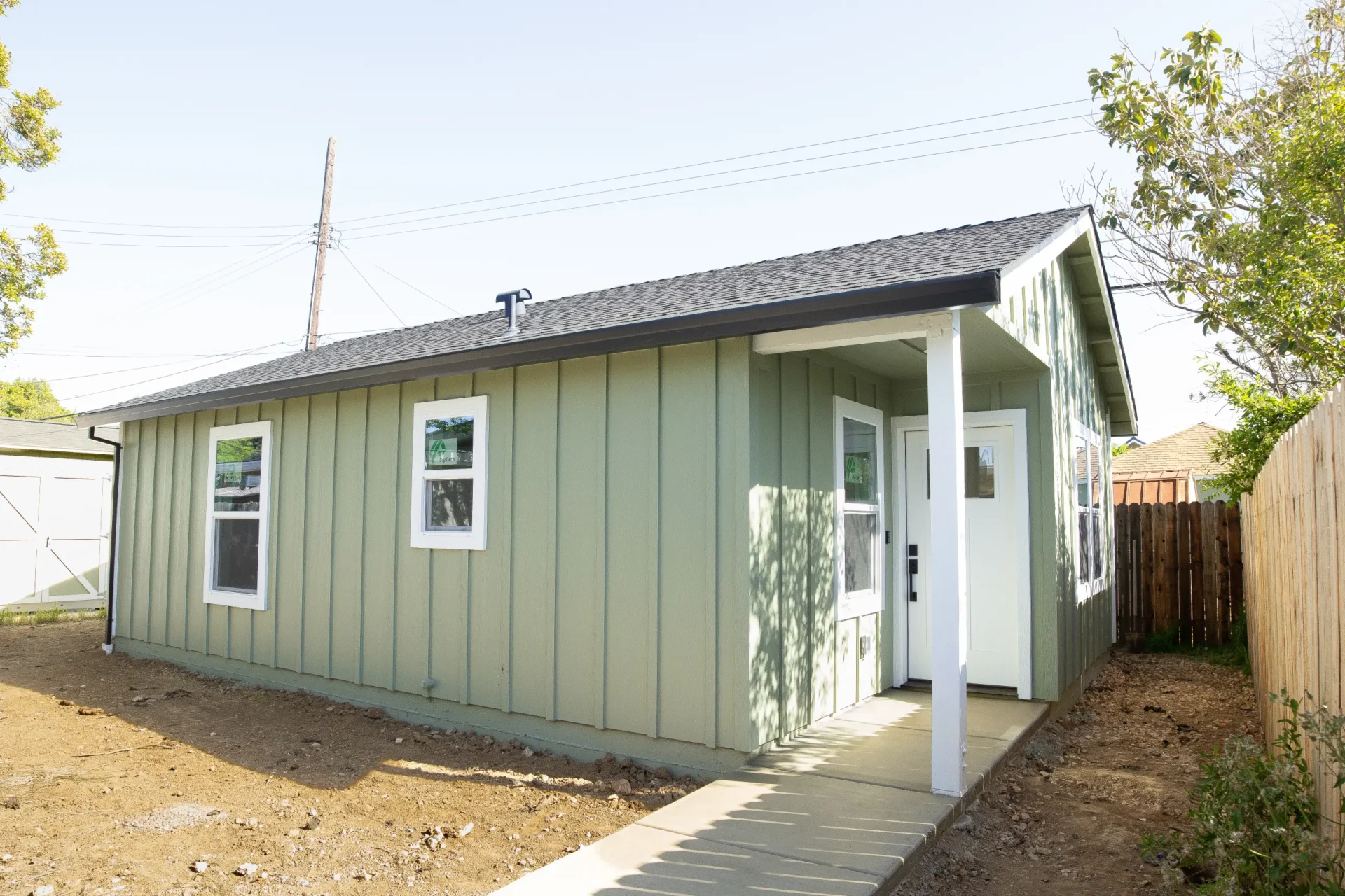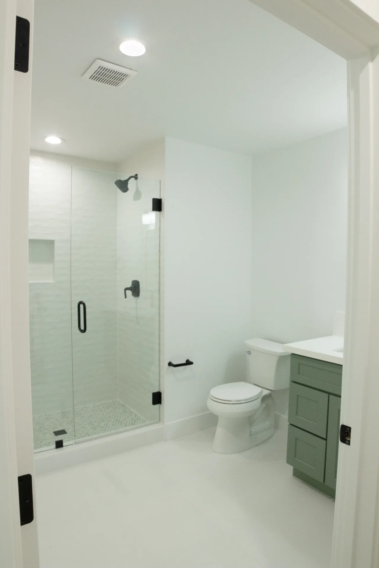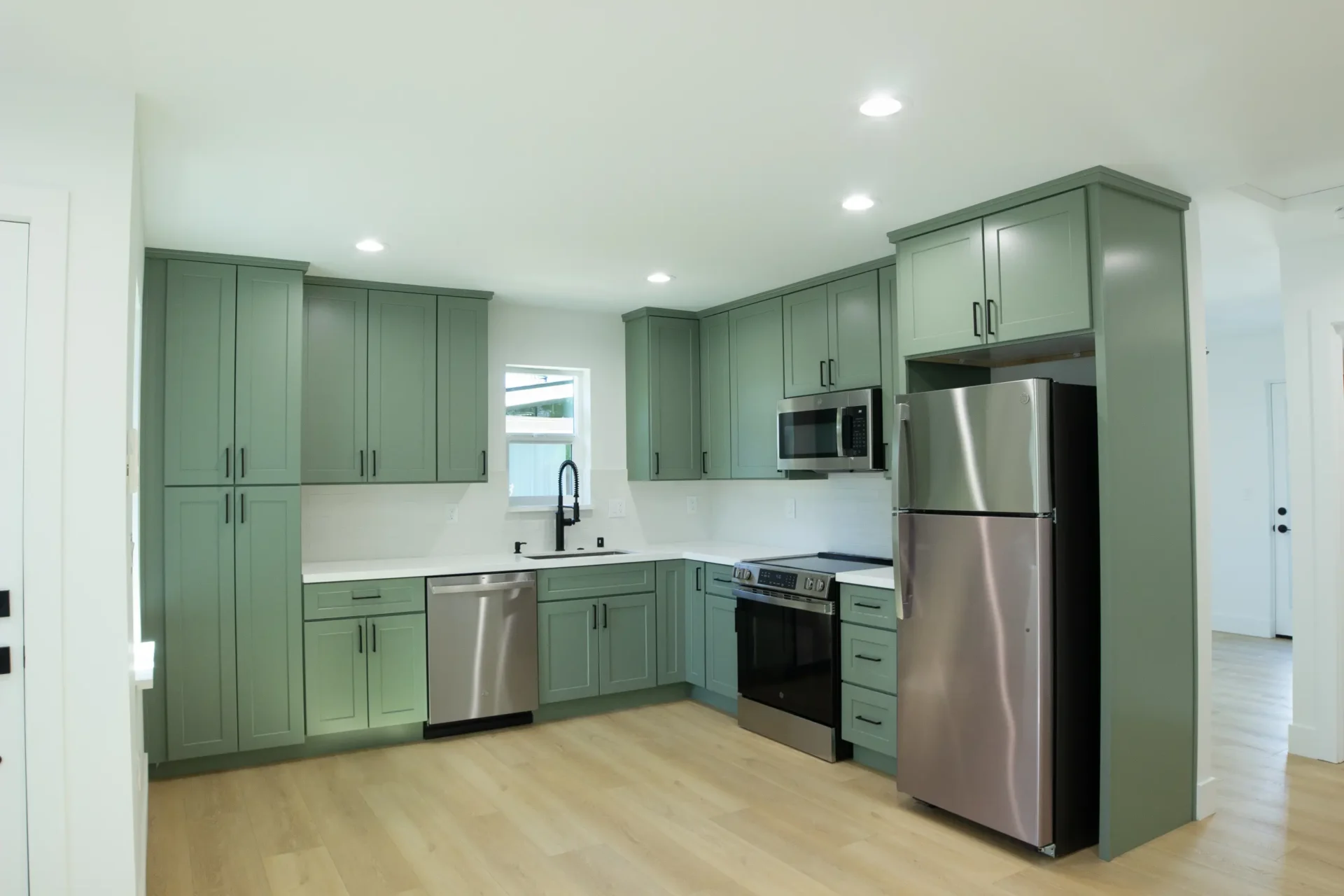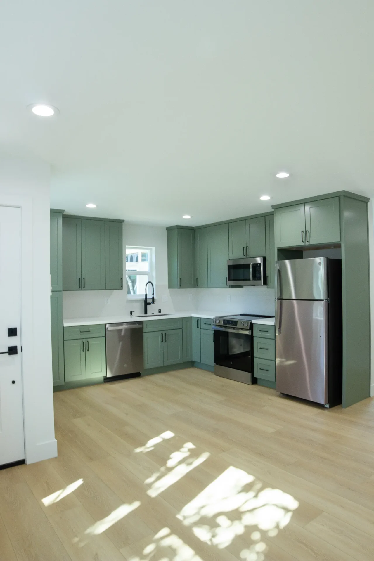 1 bed 1 bath 600 SF detached ADU featuring our olive bundle with black finishes. This unit also features a 32 SF covered front porch. For this ADU the client requested to take out the bedroom door in order to create a studio feel.