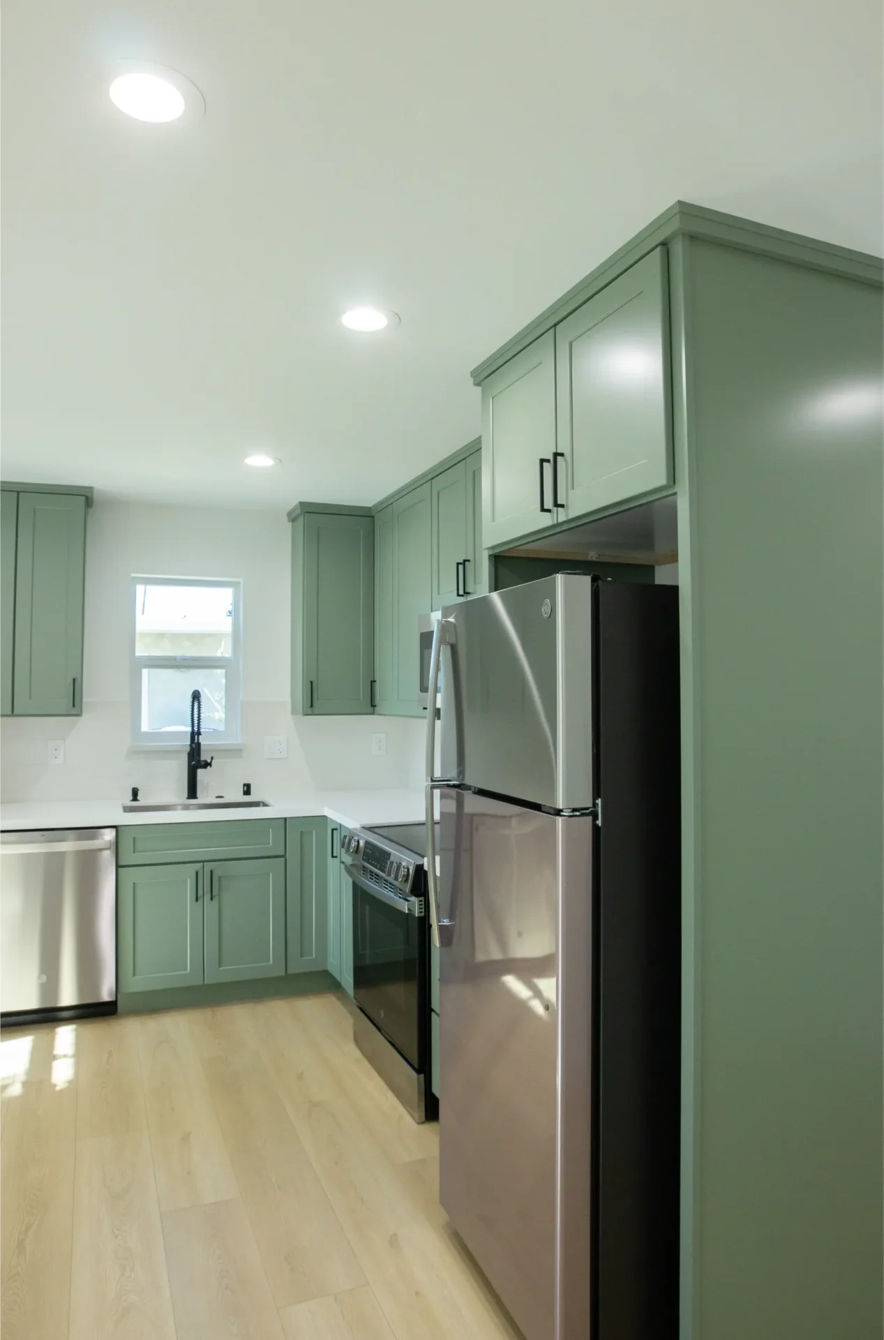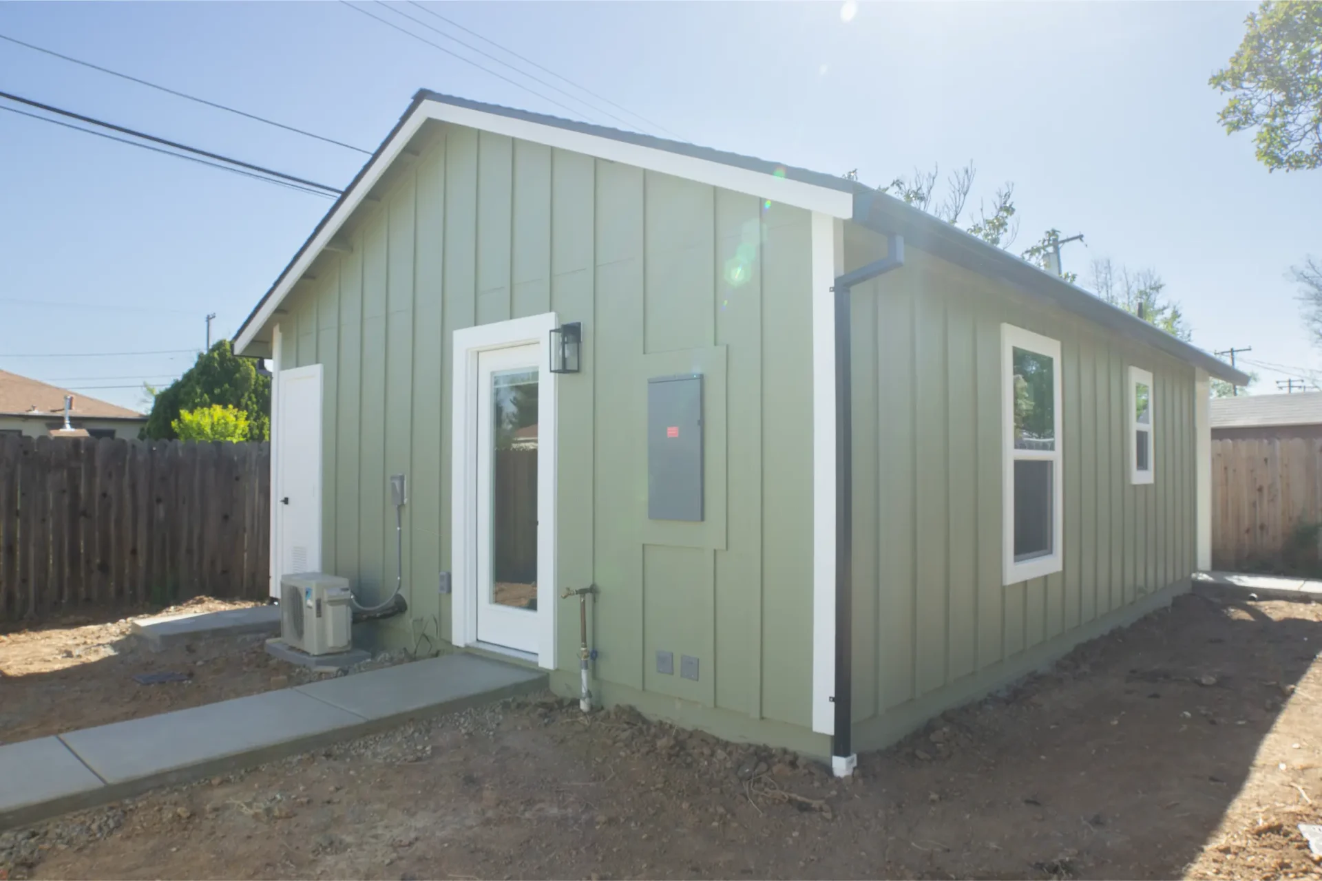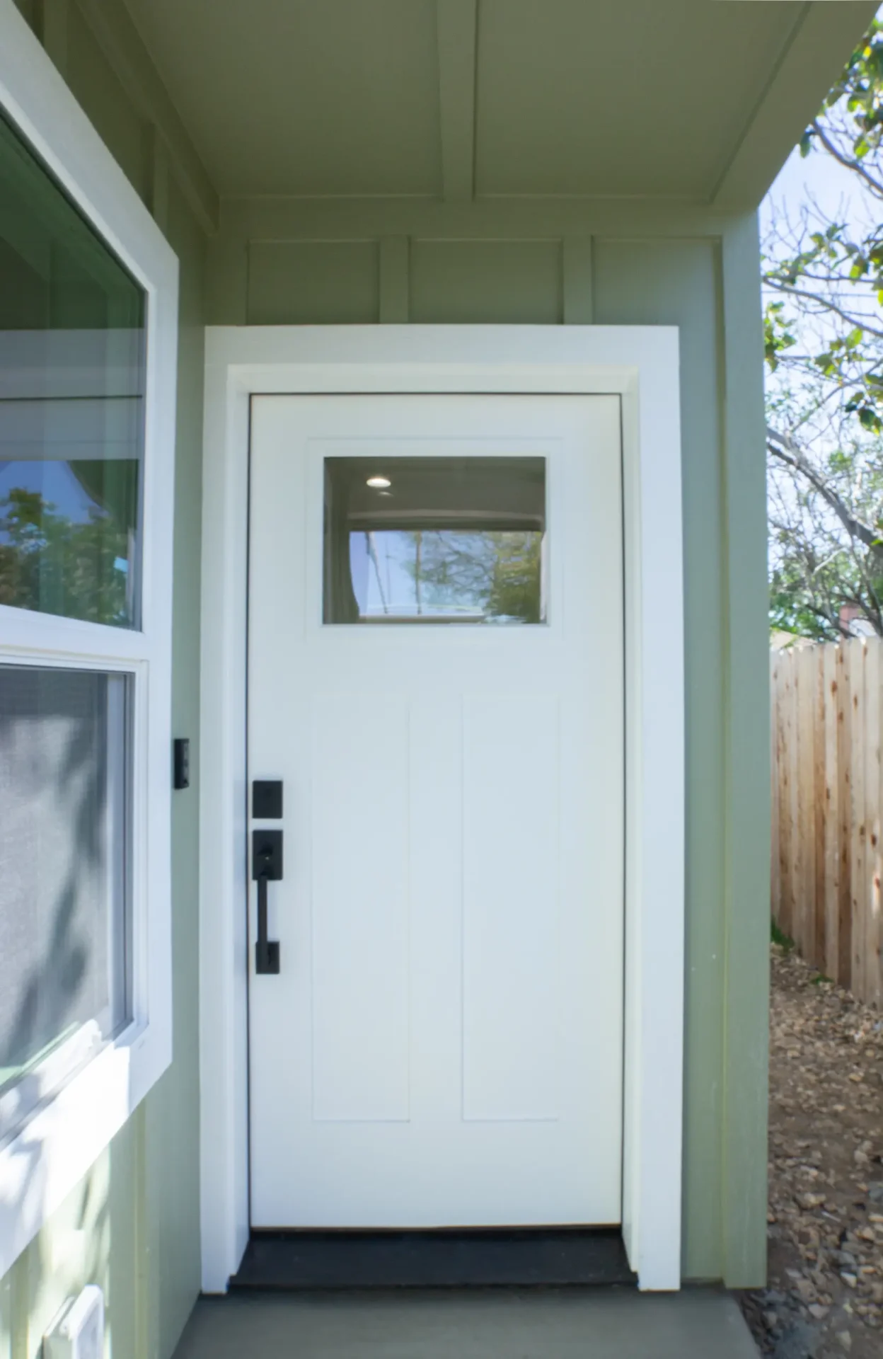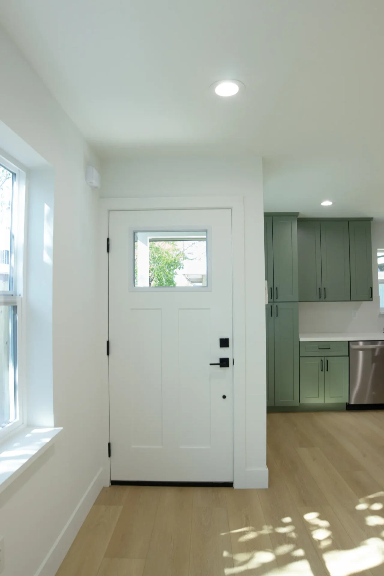 1 bed 1 bath 600 SF detached ADU featuring our olive bundle with black finishes. This unit also features a 32 SF covered front porch. For this ADU the client requested to take out the bedroom door in order to create a studio feel.