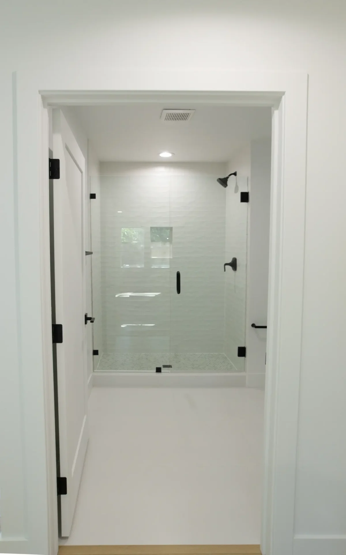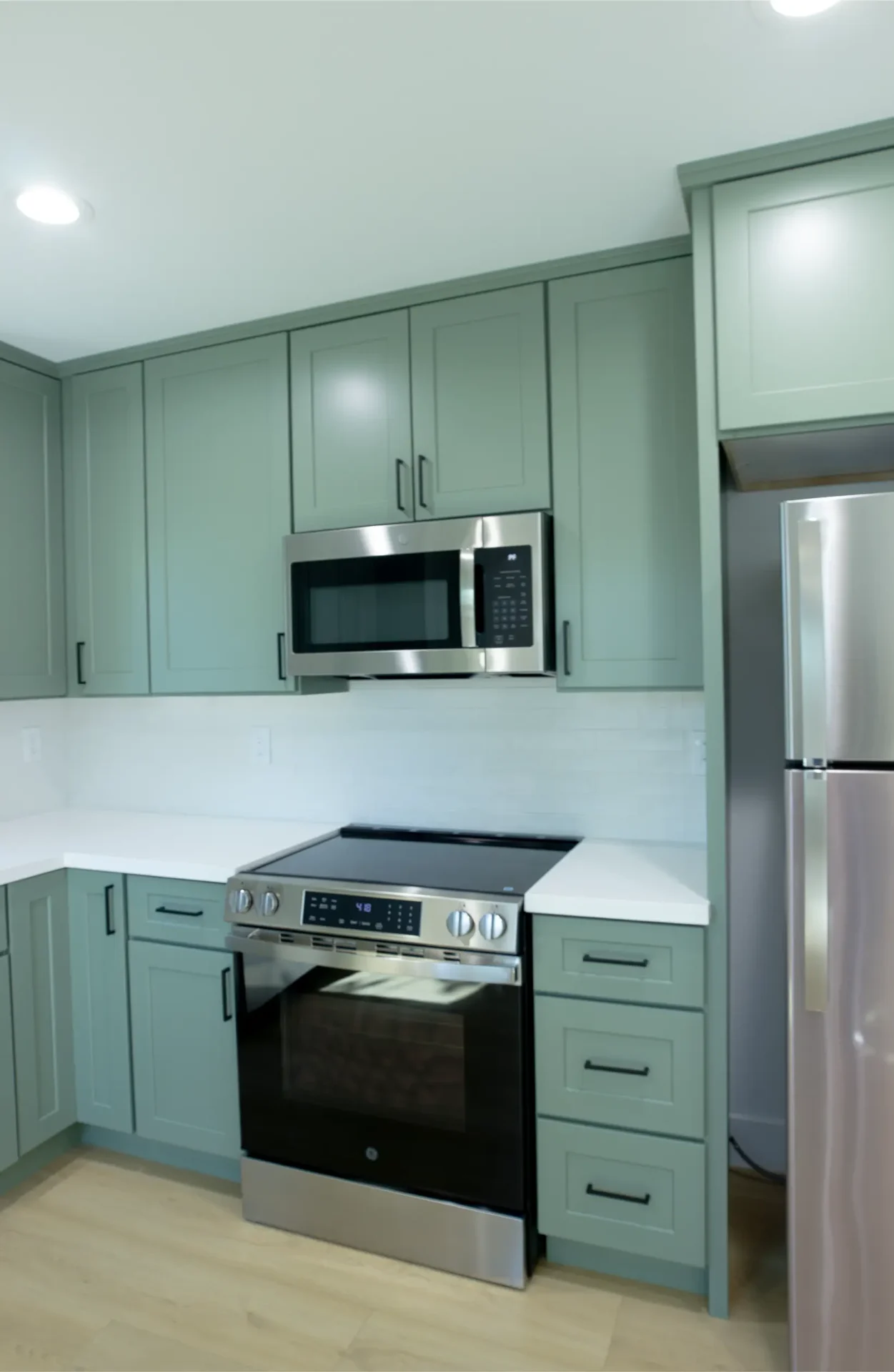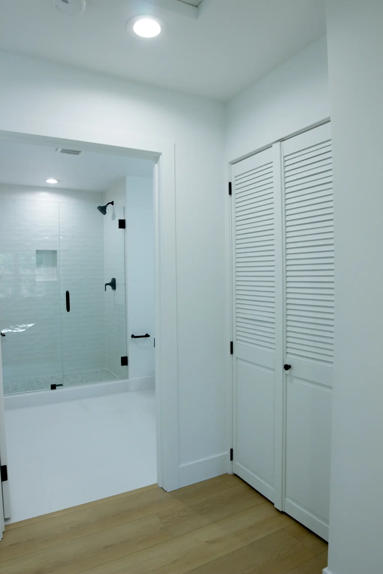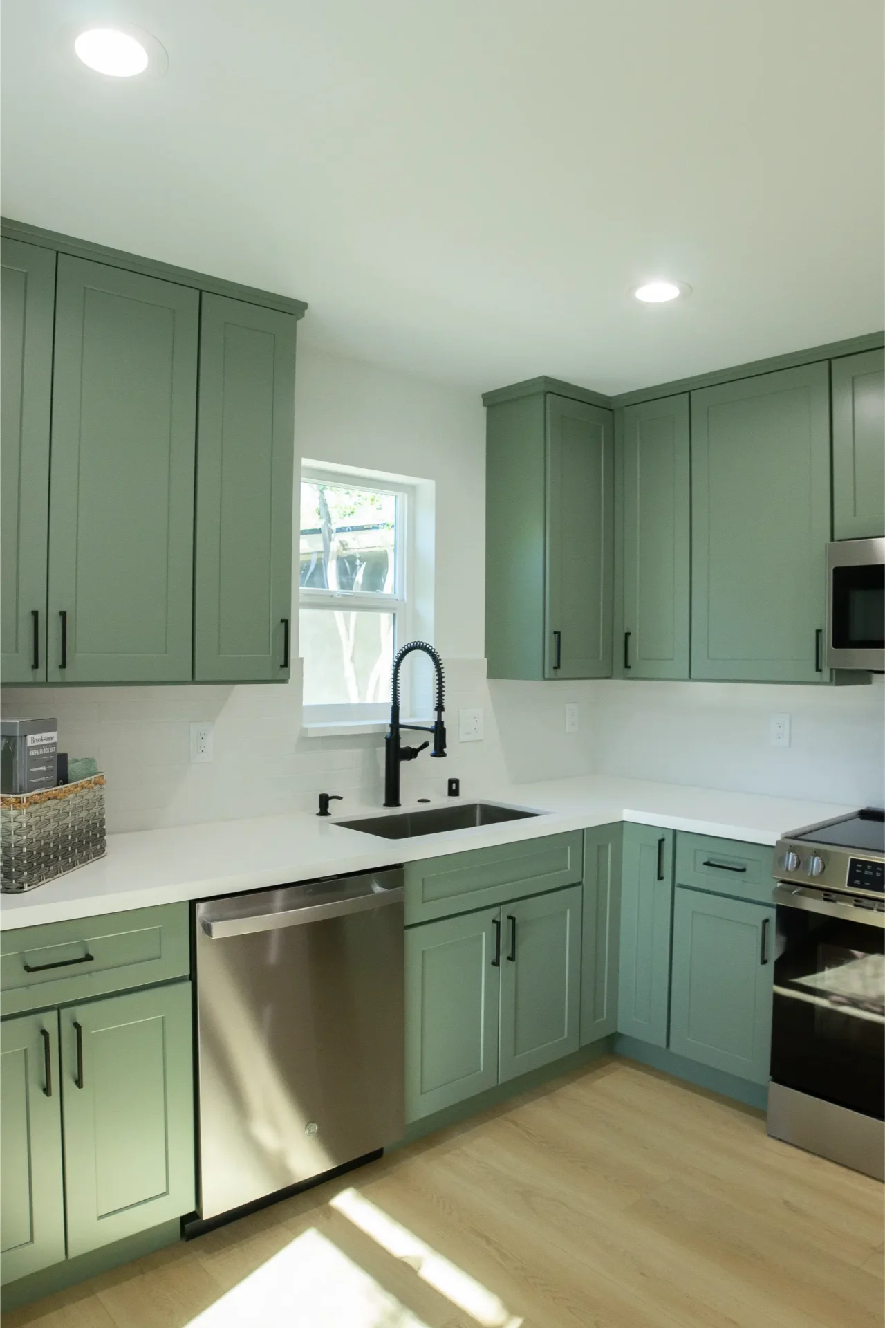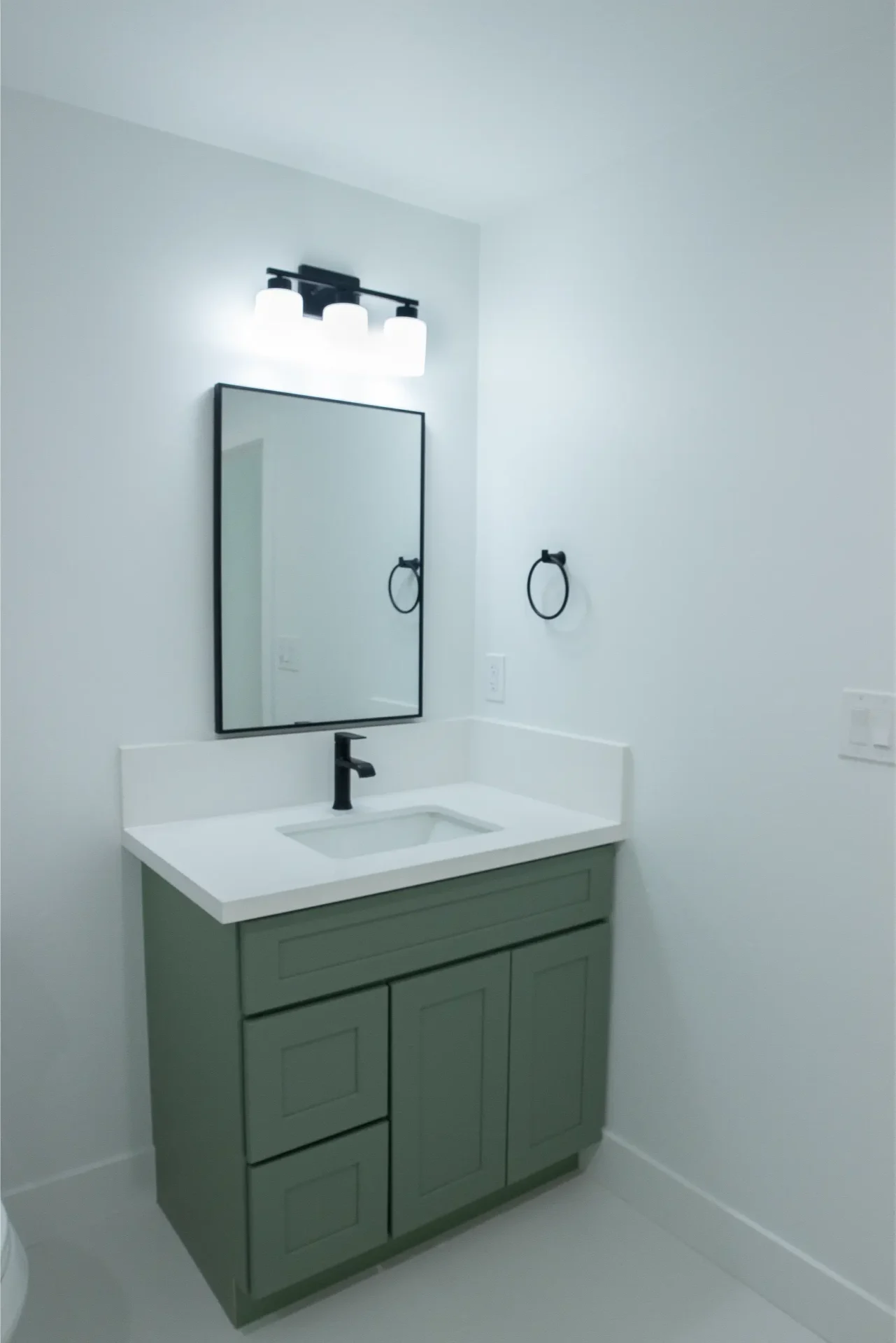 1 bed 1 bath 600 SF detached ADU featuring our olive bundle with black finishes. This unit also features a 32 SF covered front porch. For this ADU the client requested to take out the bedroom door in order to create a studio feel.